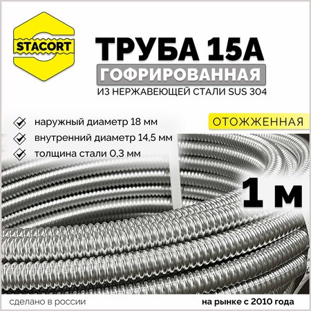 Труба нержавеющая гофрированная марки STACORT - это качественный, коррозионно-стойкий материал для монтажа отопительных, газовых, водоснабжающих трубопроводов, используемых в бытовых, коммерческих и производственных целях. Основные достоинства* устойчивость к коррозии: нержавеющая сталь марки SUS304 защищает трубопровод от внешней и внутренней коррозии* гибкость и пластичность: гофрированная поверхность трубы, толщина стенки 0,3 мм и термическая обработка позволяет изгибать участки трубопровода в любой плоскости с минимальным радиусом изгиба с сохранением неизменного внутреннего проходного сечения* надежность в эксплуатации: нержавеющая гофротруба STACORT выдерживает рабочее давление до 16 Атм. и устойчива к гидравлическим ударам до 60 Атм при рабочей температуре 20 градусов Цельсия.* простой монтаж: подключение отдельных участков трубопроводов из нержавеющей гофрированной трубы и монтаж трубопроводов в целом осуществляется с помощью латунных обжимных соединений STACORT. * срок службы не менее 30 лет. Применение гофрированной трубы STACORT Универсальный в использовании материал и применяется в следующих областях:* Отопление: труба совместима с любыми типами теплоносителей, не агрессивных к нержавеющей стали марки SUS304* Водоснабжение любого типа: горячее, холодное, питьевое, техническое* Системы охлаждения (погружной чиллер)* Системы водяного пожаротушения, системы кондиционирования и вентиляции воздуха* Кабель канал: гибкий металлический герметичный шланг для прокладки электропроводки и слаботочных сетей* Гибкая подводка для подключения газовых приборов (газовые плиты, баллоны, котлы, газгольдер