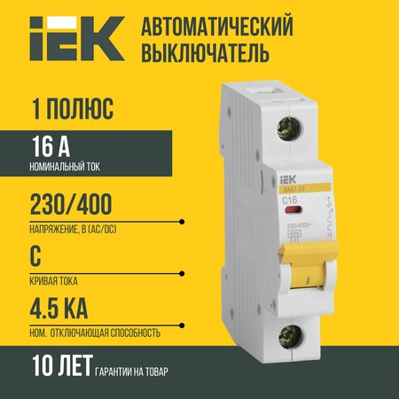 Автоматический однополюсный выключатель IEK ВА47-29 16А C 4.5кА представляет собой механический коммутационный аппарат, способный включать, проводить и отключать токи при нормальном состоянии цепи, а также включать, проводить в течение заданного времени и автоматически отключать токи в указанном аномальном состоянии цепи, таких, как токи короткого замыкания. Область применения данного выключателя включает в себя электрические сети низкого напряжения, где он применяется для коммутации и защиты электрических сетей и аппаратов различного назначения. Принцип действия выключателя заключается в том, что включение-отключение производится рычажком, а провода подсоединяются к винтовым клеммам. Защелка фиксирует корпус выключателя на DIN-рейке и позволяет при необходимости легко его снять. Коммутацию цепи осуществляют подвижный и неподвижный контакты, а механизм расцепления приводится в действие одним из двух расцепителей: тепловым или магнитным. Дополнительные принадлежности или аксессуары, входящие в стандартную комплектацию, включают само изделие. Тип расцепления данного выключателя - C, номинальное напряжение составляет 220 В, количество полюсов - 1, монтаж на DIN-рейку - да, частота тока - 50 Гц, максимальное сечение подключаемого кабеля - 25 мм², подключение дополнительных контактов - да, механизм расцепителя - термомагнитный, тип напряжения - переменное (AC), тип элемента управления - рычажное, модульный - да, подключение дополнительных контактов - да. Номинальный ток составляет 16 А, количество полюсов - 1, количество в упаковке - 1.0, тип - автоматический выключатель, модульный - да, монтаж на DIN-рейку - да, тип расцепления - C, частота тока - 50.0, отключающая способность - 4.5, тип напряжения - переменное(AC), механизм расцепителя - электромагнитный, регулировка теплового расцепителя - да, максимальное сечение подключаемого кабеля - 25.0, класс защиты (IP) - IP20, кабельная клемма - да, номинальное напряжение - 220В.