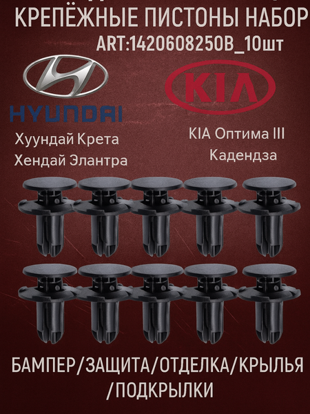 Пистон крепления подкрылок, защиты, обшивки для CRETAELANTRAEQUUSG70GENESISH-1I10I30I40SANTA FESOLARISSONATATUCSON / IX35RIO Комплектация 10 клипс автомобильных, крепеж, клипсы для автомобиля, OEM 865952T500 Kia, Hyundai Клипсы для автомобилей универсальные разных видов. Ремкомплект автотовары предназначены для ремонта крыла, двери, бампера, обшивки салона и багажника подкрылка. Упакован в прочный пластиковый контейнер, который разбирается на три части. Таким образом, автокрепеж и сьемник расфасованы и ими удобно пользоваться. Пистоны для авто обеспечивают надежное крепление. В набор съемников входит ключ металлический с пластиковой ручкой и съемники автомобильных клипс. Крепежный инструмент подходит на многие марки автомобилей, как отечественного производства, так и иномарки. Кроме того, универсальное крепление и съемники позволяют без усилий и повреждений выполнять работы с обшивкой автомобиля, снимая и устанавливая клипсы без риска повреждения поверхности. Таким образом, клипса крепежная автомобильная, удобства в использования и сохраняет внешний вид автомобиля. Клипсы - обеспечивают универсальное крепление, позволяя безопасно и эффективно осуществлять все необходимые работы по автосервису и техническому обслуживанию автомобилей. Набор клипс для автомобилей представляет собой незаменимый инструмент на рынке автомобильного крепежа, который удовлетворит требования даже самого требовательного пользователя. Удобные штучки для машины хороший подарок автолюбителям. Приобретая рем комплект, вы гарантированно получаете качественный авто крепеж, который прослужит вам долгие годы, обеспечивая надежное и безопасное крепление деталей вашего автомобиля.