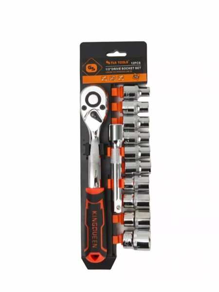 Трещоточный ключ с шестигранными головками – это инструмент, который позволяет затягивать и откручивать гайки и болты с шестигранной головкой. Он состоит из ручки с механизмом трещотки, на конце которой располагается сменный набор головок различных размеров. Такой инструмент позволяет быстро и удобно работать с крепежом различных размеров, не прибегая к переключению головок или замене инструмента. В набор инструментов по ремонту трещоточный ключ 1/2 дюйма для ремонта автомобиля любых марок входят и 10 штук шестигранных торцевых головок на планке под квадрат 1/2 следующих размеров 8, 10, 11, 12, 13, 14, 17, 19, 21, 24, мм. изготовленных из хром-ванадиевой стали защищая от коррозии. Предназначены для обслуживания монтажа и демонтажа, шиномонтажа резьбовых соединений колес быстрого откручивания или закручивания гаек, болтов, винтов от дисков с шиной с помощью ручного торцевого ключа трещотки входящего в комплект набора