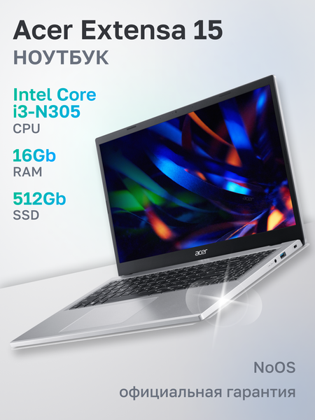 **Ноутбук Acer Extensa 15 EX215-34-32RU** — это модель ноутбука, которая имеет следующие характеристики: * **Процессор**: Intel Core i3-N305. * **Оперативная память**: 16 ГБ. * **Накопитель**: SSD на 512 ГБ. * **Дисплей**: диагональ 15,6 дюйма, тип матрицы IPS, разрешение Full HD (1920 x 1080). * **Цвет**: серебристый. Эта модель поставляется без операционной системы. Обратите внимание, что характеристики могут незначительно отличаться от указанных в зависимости от конкретной партии товара. Для получения более точной информации рекомендуется обратиться к официальному сайту производителя или продавцу.