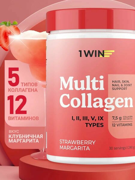 Экстренная компенсация дефицита коллагена в организме - Мульти коллаген с витамином C от 1WIN. БАД содержит 5 типов коллагена (I, II, III, V, IX) и витаминный комплекс, включающий витамины E, A, D3, группы B. В одной порции - высокая дозировка коллагена - 7,5 граммов. Гидролизованная форма и витамин С обеспечат более легкое усвоение ферментов и быструю “доставку” белка в кровь. Для достижения наилучшего эффекта принимайте мультиколлаген курсом от 2-3 месяцев. Вы заметите улучшение структуры и состояния волос, они станут крепкими, блестящими, прекратится выпадение. Кожа подтянется, станет упругой и эластичной. Укрепятся ногтевые пластины, перестанут слоиться. Восполнение дефицита коллагена положительно скажется на здоровье костной ткани, суставов, хрящей, особенно если вы интенсивно занимаетесь спортом. Витаминный комплекс повысит тонус организма и улучшит общее самочувствие. Упаковка содержит 240 граммов продукта (30 порций). В комплекте идет мерная ложечка. Встряхните банку, если сверху ложечки не оказалось - она опустилась на дно. Добавка имеет приятный вкус Клубничной Маргариты. Приготовьте напиток, используя мерную ложечку. Смешайте порцию мульти коллагена с теплой водой или соком (100-150 мл). Принимайте утром за полчаса до еды.