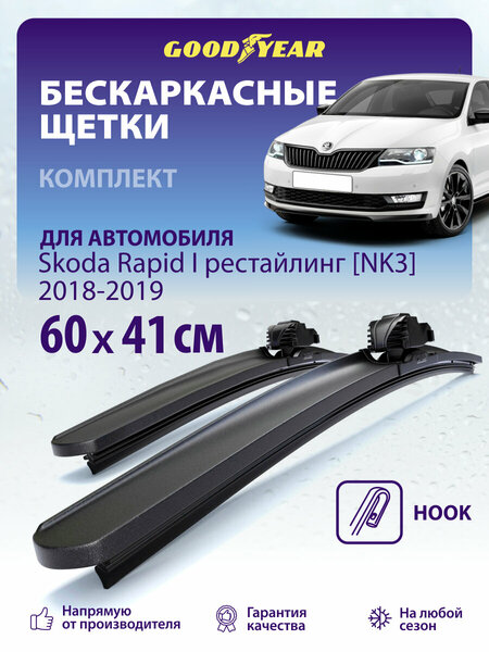 Бескаркасные щетки стеклоочистителя Goodyear на Skoda Rapid 1 [NK3] (Шкода Рапид 2018 2019, Шкода Рапид рестайлинг, лифтбек). Размер 60+41 см (600 400), крепление Hook (Крючок). Благодаря уникальной системе креплений MultiClip комплект стеклоочистителей просто установить на поводки без использования дополнительных переходников. Автомобильные дворники имеют резиновое лезвие самого высокого класса Triple A, что гарантирует отличный результат очистки стекол и долговечность их использования. Бескаркасные дворники оснащены аэродинамическим спойлером, который обеспечивает плотное прилегание лезвия к стеклу и качественную очистку во время движения на высокой скорости. Каркас щеток усилен дополнительными направляющими из нержавеющей стали, которые фиксируют резиновое лезвие и обеспечивают хорошую прижимную силу. Всесезонные щетки стеклоочистителя сохраняют превосходные чистящие свойства как в мороз (до -40 С), так и в жару (до +70 С). Могут использоваться как щетки стеклоочистителя зимние. Всесезонные дворники Goodyear поставляются в антивандальной упаковке из плотного прозрачного пластика, которая обеспечивает сохранность и целостность щеток. Каждая упаковка защищена от подделок голограммой с уникальным номером. Только всесезонные щетки стеклоочистителя с этим знаком, являются оригинальным лицензионным продуктом Goodyear с гарантированно высоким качеством.
