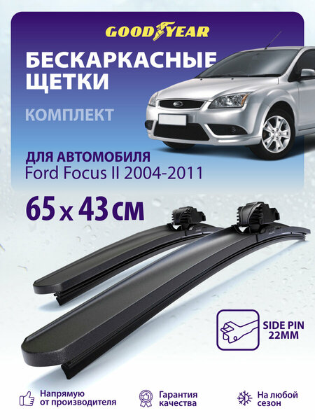 Бескаркасные щетки стеклоочистителя Goodyear на Ford Focus 2 Sedan [DA] (Форд Фокус 2, Рестайлинг) 2004-2011. Размер 65+43 см (650 430), крепление Side Pin 22mm (Боковой штырь). Благодаря уникальной системе креплений MultiClip комплект стеклоочистителей просто установить на поводки без использования дополнительных переходников. Автомобильные дворники имеют резиновое лезвие самого высокого класса Triple A, что гарантирует отличный результат очистки стекол и долговечность их использования. Бескаркасные дворники оснащены аэродинамическим спойлером, который обеспечивает плотное прилегание лезвия к стеклу и качественную очистку во время движения на высокой скорости. Каркас щеток усилен дополнительными направляющими из нержавеющей стали, которые фиксируют резиновое лезвие и обеспечивают хорошую прижимную силу. Всесезонные щетки стеклоочистителя сохраняют превосходные чистящие свойства как в мороз (до -40 С), так и в жару (до +70 С). Могут использоваться как щетки стеклоочистителя зимние. Всесезонные дворники Goodyear поставляются в антивандальной упаковке из плотного прозрачного пластика, которая обеспечивает сохранность и целостность щеток. Каждая упаковка защищена от подделок голограммой с уникальным номером. Только всесезонные щетки стеклоочистителя с этим знаком, являются оригинальным лицензионным продуктом Goodyear с гарантированно высоким качеством.