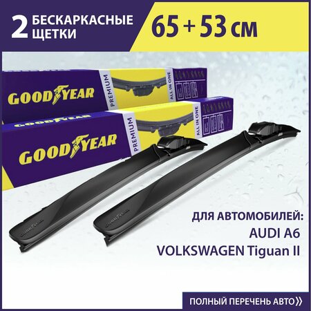 Бескаркасные щетки стеклоочистителя Goodyear «Premium» имеют уникальную систему креплений Clip Adapters. Благодаря этому комплект стеклоочистителей подходит для использования на 99,8% всех моделей легковых автомобилей. В комплект входят автомобильные дворники (размеры: 65 см + 53 см), арт. GY000446, арт. GY000441. Каждая щетка стеклоочистителя укомплектована 9 адаптерами на 11 видов крепления: Hook, Side Pin, Push Button, Pinch Tab, Bayonet, Narrow Push Button, Guide Lock (DNTL1.1), Cap Lock (VATL5.1), Cover Lock (MBTL1.1). Бескаркасные дворники Goodyear оснащены аэродинамическим спойлером, который обеспечивает плотное прилегание лезвия к стеклу и качественную очистку во время движения на высокой скорости. Каркас щеток усилен дополнительными направляющими из нержавеющей стали, которые фиксируют резиновое лезвие и обеспечивают хорошую прижимную силу. Дворники для автомобиля «Premium» имеют резиновое лезвие самого высокого класса Triple A, что гарантирует непревзойденный результат очистки стекол и долговечность их использования. Всесезонные щетки стеклоочистителя сохраняют превосходные чистящие свойства как в мороз (до -40 ̊С), так и в жару (выдерживают до +70 ̊С). Могут использоваться при любых погодных условиях и в любое время года, в том числе как щетки стеклоочистителя зимние. Автомобильные щетки прекрасно выполняют свои функции, не оставляя полос и разводов. На каждой упаковке всесезонные дворники имеют защиту от подделки – голограмму с уникальным номером. Только бескаркасные щетки с этим знаком являются оригинальным лицензионным продуктом Goodyear с гарантированно высоким качеством. Комплект дворников Goodyear «Premium» (размеры щеток: 65 см + 55 см, щетки стеклоочистителя 650 550 мм 2 шт) можно устанавливать как на классические, так и на распашные системы стеклоочистителей. Они подходят для автомобилей для левого и правого руля (праворульного авто). Крепления Боковой зажим (Pinch tab), Боковой штырь (Side pin), Верхний замок (Top lock), Кнопка (Push button), Крючок (Hook / J-Hook), Узкая кнопка (Narrow Push Button), Штыковой замок (Bayonet arm), Направляющий замок (Guide Lock), VATL5.1, DNTL1.1, MBTL1.1. Дворники для автомобиля Ауди А6, Ауди А6 Авант, Ауди РС6 Авант, Ауди с6, воях пассион Voyah Passion, вояж фри, воя фри, Фольксваген Тигуан 2