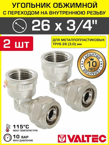 2 шт - Угольник 90 гр. обжимной 26 мм х 3/4" ВР VALTEC для металлопластиковых труб 26(3,0) / Переходной фитинг угловой под обжим с переходом на внутреннюю резьбу ДУ20, арт. VTm.352. N.002605