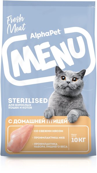 Сухой полнорационный корм холистик с домашней птицей для взрослых стерилизованных кошек и котов AlphaPet Menu 10кг. Рекомендован для взрослых собак всех пород с 1 года. AlphaPet Menu - натуральный сбалансированный рацион со свежем мясом, который точно понравится вашему питомцу! Свежее мясо, а также деликатная термическая обработка позволяет максимально сохранить естественные витамины и минеральные вещества в продукте, что обеспечивает прекрасный вкус и отличную усвояемость рациона. Преимущества корма для питомца: Свежее мясо в составе; Сбалансированное питание; Здоровая кожа и блестящая шерсть; Здоровое пищеварение; 100% натуральные ингредиенты. Форма и диаметр крокета: круг 10мм. Состав: пшеница, мясные ингредиенты (в т. ч. дегидрированное мясо индейки, говядины и свинины, свежая курица и индейка), рис, гидролизат животного белка, животный жир, витаминно-минеральная смесь, свекольный жом, пивные дрожжи, DL-метионин, таурин, антиоксидант. Содержание питательных веществ на 1 кг: Сырой протеин 27%, сырой жир 9%, сырая клетчатка 2,5%, сырая зола 8%, кальций 1,5%, фосфор 1,1%, влажность 8%. Энергетическая ценность на 100г: 347 ккал/1 453 кДж.