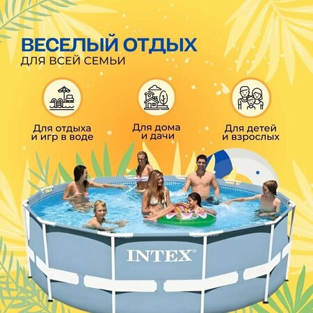 Каркасный бассейн Intex Prism Frame самого востребованного размера 366х122 см с фильтр-насосом и лестницей! Стенки бассейна сделаны из трех отдельных особо прочных слоев: два слоя плотного винила и один полиэстер. У бассейнов серии Prism Frame усиленный стальной каркас, а у этой модели к тому же есть опоясывающая лента из полипропилена. Бассейн выдерживает большие нагрузки, в нем одновременно могут купаться несколько человек. Характеристики товара Размеры : 366х122см Объем: 10685 л при 90% заполнении Время сборки: 40 мин Вес: 47,3 кг Размер упаковки: 53х46х120 см В комплекте лестница и фильтр-насос.