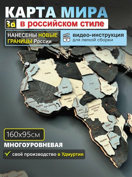 3D-карта мира на стену 1600*950 из дерева - это оригинальный настенный декор для любого помещения, будь то квартира, офис или загородный дом. Карта мира выполнена из экологически чистого материала - дерева, что делает ее безопасной для использования в любом помещении. Благодаря технологии гравировки, все названия городов и стран остаются яркими и не стираются со временем. Декоративное панно состоит из нескольких деталей, которые вырезаются и крепятся отдельно. Это придает ей объем и делает ее уникальной. Для большего объема вы можете заказать подложку для карты по артикулу 3211825935 Карта мира обладает сквозными отверстиями, что позволяет устанавливать на нее флажки, геометки и пины. Это делает ее многофункциональной и позволяет использовать ее для изучения и запоминания стран, столиц и других городов. Карта мира упакована в плотную картонную коробку и термоусадочную пленку, что обеспечивает ее сохранность при транспортировке. В комплект входят 2 самолета, 2 корабля и роза ветров, что делает подарок еще более интересным и запоминающимся.