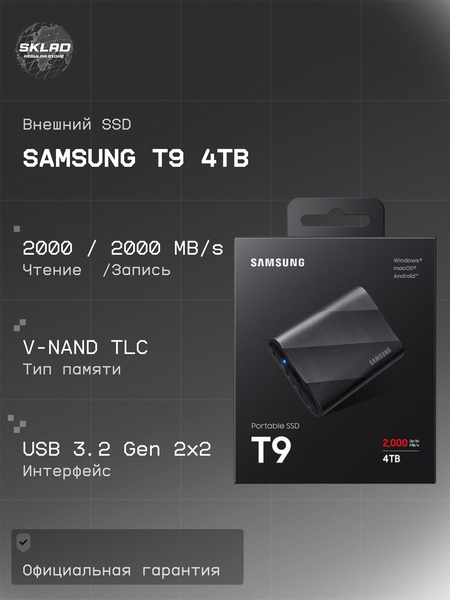 Внешний SSD Samsung T9 Portable это обновленная версия получившая интерфейс подключения нового поколения, рост скорости, современный дизайн и увеличение гарантийного срока с 2 до 5 лет.