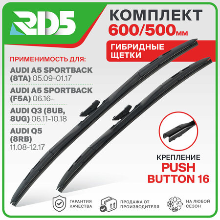 Популярная торговая марка щеток стеклоочистителя RD5. Нашу продукцию выбирают многие автолюбители, об этом говорят множество положительных отзывов! Высокое качество продукции в сочетании с не большой ценой делает наш товар отличным выбором! Конструкция щеток стеклоочистителя RD5 обладает высокой надежностью и устойчивостью. Материал резинок стеклоочистителя произведен из высококачественного сырья и имеет двойное графитовое покрытие, что делает работу дворников бесшумной и комфортной! Мы уверены в нашей продукции на 100%. Комплект гибридных щеток стеклоочистителя 600 мм и 500 мм (60 см + 50 см). Крепление Push Button 16 мм. Применимость : AUDI A5 Sportback (8TA) 05.09-01.17; Ауди А5 Спортбек; AUDI A5 Sportback (F5A) 06.16-; Ауди А5 Спортбек; AUDI Q3 (8UB, 8UG) 06.11-10.18; Ауди Кью 3; AUDI Q5 (8RВ) 11.08-12.17; Ауди Кью 5;