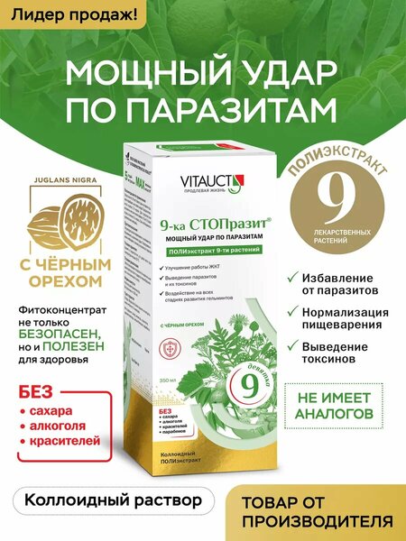 Антипаразитарный комплекс 9-ка СТОПразит от Компании Витаукт - это натуральный ПОЛИэкстракт из 9-ти лекарственных растений, горечи которых пагубно действуют на все виды, формы и стадии паразитов! Средство от глистов 9-ка СТОПразит способствует: поражению гельминтов на всех стадиях развития (яйца, цисты, личинки, взрослые формы), безопасному выведению паразитов из ЖКТ и заживлению слизистой кишечника. Растительный противопаразитарный комплекс имеет широкий спектр воздействия на гельминты (нематодозы, цестодозы, трематодозы). Горечи способствуют похудению, ускоряют обмен веществ. Противопаразитарный сбор оказывает антибактериальное, противовоспалительное, иммуномодулирующее действие. Фитокомплекс также работает как гепатопротектор, благодаря чему достигается детокс и очищение организма, налаживается отток желчи, улучшается пищеварение. Фитосбор выводит токсины, восстанавливает пораженные органы. А также рекомендован для профилактики. Все паразиты боятся 9-ку! 9-ка СТОПразит VITAUCT изготовлена из сырья, выращенного на собственных плантациях VITAUCT в предгорье Кавказа. СВОЙСТВА КОМПОНЕНТОВ: • Оказывают комплексное антипаразитарное действие на организм: обладают антигельминтной, бактерицидной, противопротозойной и противогрибковой активностью. • Обладают широким спектром антигельминтного действия: антицестодная, антинематодная и антитрематодная активность. • Способствуют уничтожению и выведению паразитов на всех стадиях развития, препятствуя возможности их дальнейшего размножения. • Обладают спазмолитическим и желчегонным действием. • Уменьшают воспаление, способствуют регенерации слизистой оболочки желудочно-кишечного тракта. • Улучшают моторику ЖКТ. • Повышают устойчивость и сопротивляемость организма при повторной инвазии. • Способствуют укреплению иммунитета. • Не оказывают токсического действия.