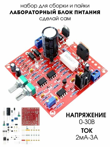 Электронный конструктор служит основной частью конструкции для сборки модели лабораторного источника напряжения и тока с диапазонами выходных параметров 0~30В и 2mA~3А. Плата запитывается от отдельно приобретаемого преобразователя 220В на 24В переменного тока (трансформатора), а также нуждается в системе активного охлаждения силового контура, состоящей из отводящего тепло радиатора. Прибор может быть установлен в любой подходящий по размерам корпус (например, от старого блока питания ПК). В первую очередь это прекрасная возможность потренироваться в практических навыках пайки и монтажа, умении осуществлять грамотный подбор комплектующих для оснащения электроприбора, изготавливаемого в индивидуальном варианте. Во-вторых, конструирование лабораторного блока питания по частям, вместе с подробным разбором и настройкой схемы силового устройства, позволит пополнить копилку теоретических знаний сформированным детальным представлением о принципах его работы. Регулировка блока осуществляется линейным способом, где излишек энергии рассеивается просто на регулирующем элементе. Практически полное отсутствие пульсаций, нет необходимости в конденсаторах на выходе Характеристика: