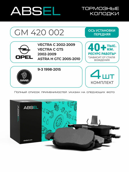 ABSEL Колодки тормозные передние GM420002 для OPEL VECTRA C 2002-2009, VECTRA C GTS 2002-2009, ASTRA H GTC 2005-2010; SAAB 9-3 1998-2015