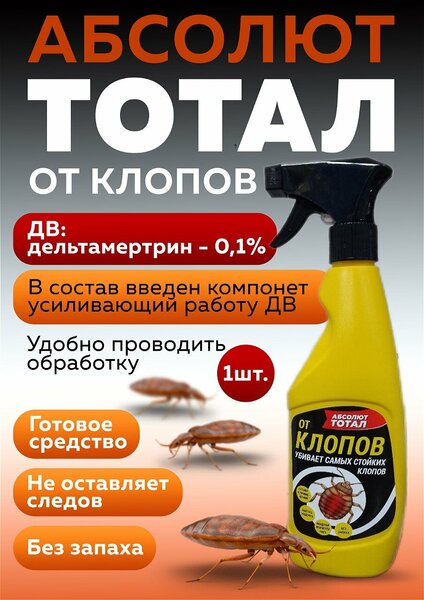Название товара: Абсолют Тотал от клопов НПО Гарант. Описание: Профессиональное инсектицидное средство для уничтожения клопов в виде готового раствора. Специально разработано для борьбы со стойкими популяциями. Удобная упаковка с курковым распылителем. Разрешено к применению в бытовых условиях. Не имеет запаха, легко наносится на поверхности и труднодоступные места. Содержит специальный компонент для усиления действия даже при малой концентрации. Сохраняет эффективность до 8 недель. Состав: содержит дельтаметрин (0,1%), стабилизатор, эмульгатор и растворитель (воду). Свойства: острое инсектоакарицидное действие в отношении клопов, остаточная активность до 2 месяцев. Относится к классу малоопасных веществ (4 класс) по ГОСТ 12.1.007-76. Умеренно раздражает слизистые оболочки. Кожно-резорбтивного и сенсибилизирующего действия нет. Слабо выраженное сенсорное раздражение кожи. В воздухе рабочей зоны не превышает 3 класса опасности (0.1 мг/м³). Назначение: для уничтожения клопов на любых поверхностях, включая невпитывающие и впитывающие влагу. Рекомендуется для жилых помещений, предприятий и учреждений. Может использоваться для обработки спален и столовых, исключая игровые комнаты. Применение: Флакон тщательно встряхнуть и повернуть защитный колпачок в положение "SPRAY". С расстояния около 30 сантиметров от поверхности, нажать на курок и обработать места скопления и передвижения клопов методом распыления. Обработке подвергаются места обитания, перелеты и места возможного расселения клопов