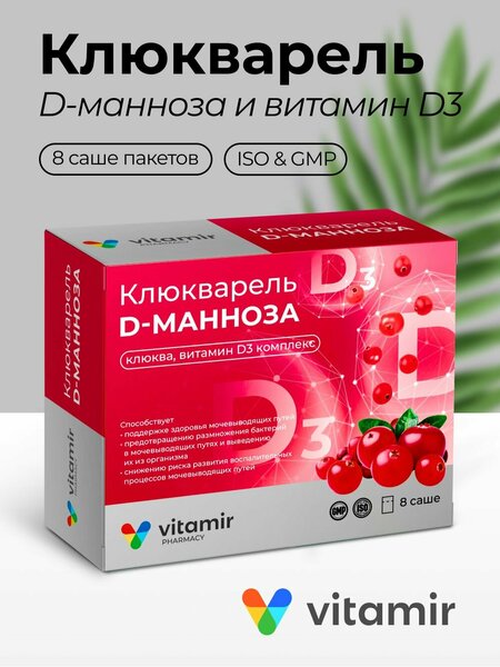БАД Клюкварель Д-манноза, клюква, витамин Д3 комплекс от цистита 8 саше пакетов. Инфекции мочевой системы представляют серьезную проблему как для женщин, так и для мужчин. Обострения и нежелательные явления в виде учащенного и болезненного мочеиспускания нарушают нормальный ритм жизни, значительно ухудшают ее качество. БАД Клюкварель Д-манноза, клюква, витамин Д3 комплекс от цистита - современное решение, способное предотвратить возможное появление негативных последствий при нарушениях функционирования мочевых путей. Компоненты комплекса способствуют: поддержке здоровья мочевыводящих путей; предотвращению размножения бактерий в мочевыводящих путях и выведению их из организма; снижению риска развития воспалительных процессов мочевыводящих путей. Входящий в состав БАД Витамин D3 (холекальциферол) - эссенциальное (жизненно необходимое) жирорастворимое соединение. Одна из главных функций нутриента - регуляция всасывания в кишечнике кальция и фосфора, а также их реабсорбции (повторного всасывания из первичной мочи). За счет этого поддерживаются необходимые уровни этих двух макроэлементов в крови. Кроме того, витамин Д принимает активное участие в реакциях иммунитета. Холекальциферол содействует стимуляции легочных макрофагов (класса клеток иммунной системы), губительных для некоторых болезнетворных бактерий. Д манноза представляет собой простой углевод, растворимый в воде. Действие нутрицевтика препятствует размножению патогенных микроорганизмов в мочевых путях, что благоприятствует нормализации их микрофлоры и может значительно снизить риск обострений. Клюква растение семейства вересковых, плоды которого благодаря своему уникальному составу длительное время используются при нарушениях мочеиспускания. По данным многочисленных исследований, выделенные из клюквенного сока проантоцианидины, как и D манноза, вызывают снижение адсорбции (прилипания) к эпителию (выстилке) мочевыводящих путей уропатогенных микробов и подавление их жизнедеятельности. Ягоды растения содержат также флавоноиды, органические кислоты и другие активные соединения, в частности гликозид арбутин и продукт его гидролиза - гидрохинон. Эти компоненты обусловливают антисептический и антиоксидантный (противоокислительный) эффект. Гидрохинон способен раздражать почечную ткань и тем самым усиливать мочеотделение. Входящий в состав БАД к пище комплекс компонентов D-маннозы, арбутина, проантоцианидинов и витамина Д3 способствует поддержанию здоровья мочевыводящих путей, препятствует размножению бактерий и способствует выведению патогенных штаммов бактерий из мочевыводящих путей, способствует поддержанию иммунитета. Противопоказания: индивидуальная непереносимость компонентов БАД, беременность, кормление грудью, нарушение углеводного обмена (в том числе сахарный диабет). Перед применением рекомендуется проконсультироваться с врачом. Способ применения и дозы: взрослым принимать 5,0 г порошка (содержимое 1 саше-пакета (стик-пакета) или 1 чайную ложку с небольшой горкой) 1 раз в день во время или непосредственно после еды, предварительно высыпать в стакан и залить 100 – 200 мл воды комнатной температуры и тщательно размешать. Продолжительность приема – 7 дней. При необходимости прием можно повторить. Попробуйте другие витамины и БАДы, таб