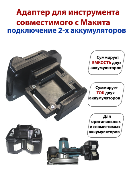 Адаптер для подключения к одному инструменту двух аккумуляторов макита. Подходит к оригинальному инструменту и совместимым с "макитовскими" аккумуляторами. Позволяет увеличить время работы инструмента и увеличить токоотдачу аккумуляторов. Особенно актуален для мощного инструмента с высоким потреблением тока (болгарки, ушм, перфораторы), а также для неоригинальных аккумуляторов, которые как правило не выдают больших токов. Изготовлен из PET-G пластика методом FDM печати.