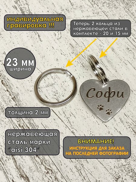 Адресник для животных "Сердечко" 23 мм - это стильный и функциональный аксессуар для собак и не только. Изготовлен из нержавеющей стали толщиной 2 мм, что обеспечивает его долговечность и устойчивость к коррозии. Серебристый цвет и форма в виде сердечка делают этот аксессуар привлекательным и заметным. Особенностью адресника является индивидуальная гравировка, которая позволяет вам выразить свою индивидуальность и любовь к питомцу. В комплекте с адресником идут два кольца разного размера - 15 и 20 мм, что позволяет подобрать наиболее подходящий вариант для ошейника вашего питомца. Закажите адресник "Сердечко" 23 мм и обеспечьте своему питомцу безопасность на прогулках. Оформляйте заказ как обычно, следуйте инструкции на последней фотографии и адресник вскоре будет у вас.