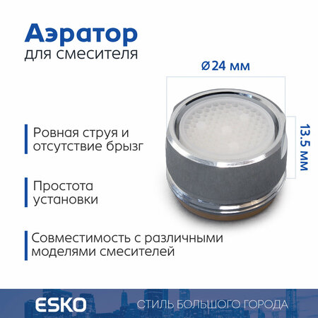 Аэратор для смесителя ESKO Soft Flow, внешняя резьба M24, корпус нержавеющая сталь
