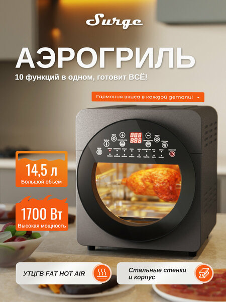Surge AeroChef 10-в-1 Умная фритюрница - профессиональное кухонное решение Революционная система приготовления • Патентованная технология циркуляции горячего воздуха 360° (FastHotAir) • Камера из медицинской нержавеющей стали с двойной теплоизоляцией • Мгновенный нагрев 1700Вт (точный контроль температуры 50-220°C) 10 профессиональных функций
