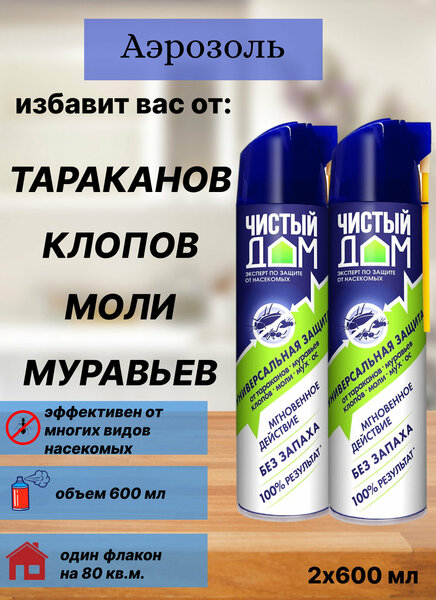 Аэрозоль средство от тараканов блох муравьев клопов 2 шт по 600 мл Чистый дом