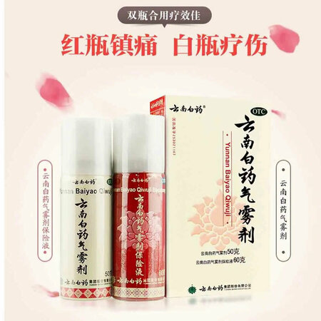 Аэрозоль Юньнань Байяо Юнь Нань Бай Яо Yunnan Baiyao 云南白药气雾剂 (ТКМ) 2 флакона разного цвета — красный 50 г и бежевый 60 г. Применение в клинической практике: ушибы и ссадины; синяки и гематомы; растяжения с кровотечением и отёком; послеоперационные кровотечения; токсические нарывы; ушибы мягких тканей; кожные инфекционные заб- ния; ревматические боли; мышечные боли. Фармакологическое действие: противовоспалительное, антисептическое, обезболивающее, ранозаживляющее и кровоостанавливающее. Секретный рецепт охраняется государством с 1902 года. Основные свойства и показания к применению в ТКМ: убирает застой Ци и крови; останавливает кровотечение; двигает кровь; укрепляет кровь; улучшает заживление; утоляет боль; применяется на открытые раны. Способ применения и дозировка: перед использованием баллон встряхнуть, распылять на расстоянии 5-10 см от кожи для исключения локального обморожения кожи. при травмах с повреждением кожи: 3-5 раз в день распылять на рану используя бежевый флакон Yunnan Baiyao Aerosol; при травмах с болью без повреждения кожи: сначала распылите красный флакон Yunnan Baiyao Aerosol Baoxianye на область с болью; если боль не утихла, через 1-2 минуты повторите процедуру, но не более 3-х раз в день; после распыления красного флакона Yunnan Baiyao Aerosol Baoxianye, используйте бежевый флакон Yunnan Baiyao Aerosol (бежевый флакон). Противопоказания и меры предосторожности: Только наружно! Ни в коем случае не распылять в глаза, рот, нос. Противопоказано беременным. Для применения у маленьких детей и у людей в старческом возрасте необходима консультация врача. При сверхчувствительной коже не применять. Лицам, подверженным аллергиям, использовать с осторожностью. При появлении на коже аллергии прекратить использование. Запрещено для лиц с аллергией на спиртосодержащие препараты. Форма выпуска: в упаковке 2 флакона разного цвета — красный 50 г и бежевый 60 г.