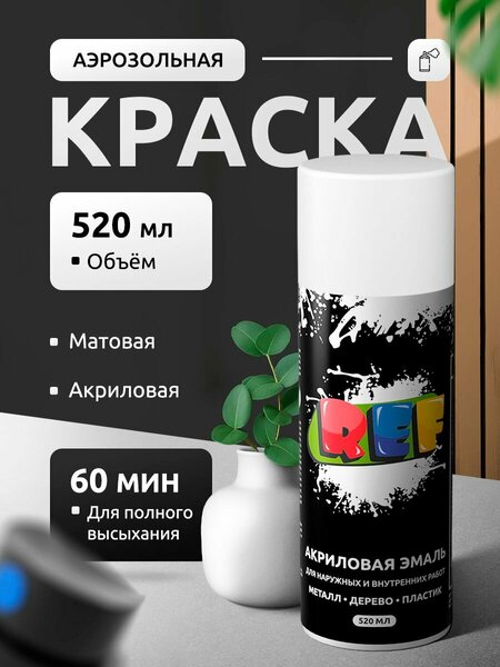 Аэрозольная краска REF — универсальная акриловая эмаль в баллоне объёмом 520 мл. Подходит для окраски дерева, металла, пластика, стекла, стен и мебели. Обладает насыщенным белым цветом с матовым блеском, легко наносится и быстро сохнет. Используется для ремонта, декора, реставрации и других домашних задач. Эмаль устойчива к выцветанию, хорошо ложится даже на старое покрытие. Идеальный выбор для DIY и бытового применения.