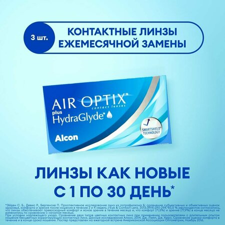 Air Optix plus HydraGlyde — линзы из силикон-гидрогелевых материалов от компаний Ciba Vision и Alcon, которые объединились и превратились в крупнейшего производителя оптических изделий и другой офтальмологической продукции. Отличные показатели кислородопроницаемости (138 Dk/t) в сочетании с отличной смачиваемостью делают эти линзы удобными и безопасными для глаз. Они отличаются повышенной устойчивостью к отложениям и предотвращают сухость глаз. Они одновременно сочетают две технологии увлажнения — HydraGlyde и SmartShield technology. Высокая гидрофильность и функция влагосодержания позволяют оптическим изделиям оставаться увлажненными 16 часов подряд. Никакого дискомфорта при отличном и стабильном зрении. Permanent Plasma Technology — плазменная обработка поверхности, которая повышает стойкость поверхности линз к отложениям. Срок замены линз составляет тридцать дней. Они предусматривают гибкий режим ношения, позволяющий носить их только днем, помещая на ночь в раствор или же использовать круглосуточно 7 дней и шесть ночей. Непрерывный режим ношения одобрить может только офтальмолог или оптометрист. Надевая линзы Air Optix plus HydraGlyde, вы дарите глазам здоровую контактную коррекцию.