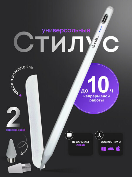 Универсальный емкостный стилус для любого экрана. Стилус для сенсорного дисплея можно использовать на планшетах, смартфонах любых производителей, а также на любых сенсорных экранах мониторов и телевизоров, смарт-часах с сенсорным экраном, автомагнитолах и т. д. Стилус для телефона имеет тонкий наконечник, процесс прорисовки будет похож на рисование ручкой. Стилус изготовлен из прочного алюминиевого сплава, который отличается своей легкостью. Наконечник сделан из специального проводящего материала, не царапает экран. Отклик пера точный. Пользоваться стилусом могут как дети и начинающие художники, так и профессионалы, использующие стилус в работе и бизнесе. Стилус для планшетов и телефонов работает без проводов, встроенная батарея позволяет использовать его автономно. На корпусе есть кнопка включения, если стилус долгое время не используется, то он автоматически отключается. Время работы от одного заряда составляет 6-8 часов, подзаряжается с помощью USB-кабеля. Для включения стилуса нужно два раза коснуться крышечки на верхней части, загорится индикатор готовности к работе. Для выключения стилуса снова дважды коснитесь крышечки. В комплект входит два сменных наконечника, так что стилус прослужит вам очень долго.