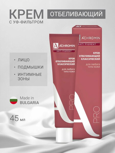 Крем Ахромин представляет собой гомогенную кремообразную массу белого цвета с ароматом розы. Косметический продукт с хорошим отбеливающим эффектом и UV защитой. Удаляет любой тип гиперпигментации на поверхности кожи – веснушки, пятна после беременности, возрастные пигментные пятна, пятна, слишком темный загар. «Ахромин» предназначен для удаления и профилактики гиперпигментации — веснушек, пятен после беременности, возрастных пигментных пятен, слишком темного загара. Используется для защиты кожи от вредного воздействия солнечных лучей.