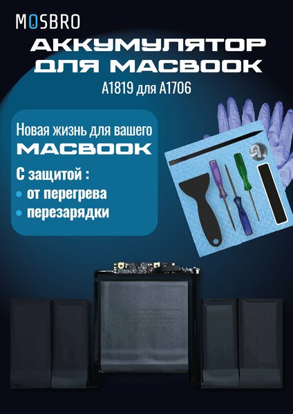 Верните жизнь вашему MacBook Pro 13” A1706 (2016-2017) с новым OEM аккумулятором A1819 и полным набором инструментов для установки! Этот OEM аккумулятор A1819 предназначен для MacBook Pro 13” A1706, выпущенных в конце 2016 и середине 2017 года. В комплект входит все необходимое для самостоятельной замены аккумулятора в домашних условиях! Что входит в комплект: Новый аккумулятор A1819 (OEM) Отвертки (необходимые для разборки MacBook Pro) Перчатки (для защиты от статического электричества) Проклейка (для надежной фиксации аккумулятора) Коврик и лопатки для снятия (для безопасного открытия корпуса) Инструкция (с подробными шагами по замене аккумулятора) Преимущества OEM аккумулятора A1819: Полная совместимость: Разработан специально для MacBook Pro 13” A1706 (2016-2017). Все необходимое в комплекте: Замените аккумулятор самостоятельно, сэкономив на услугах сервисного центра. Надежное питание: Емкость 4320mAh / 49.29Wh обеспечивает длительное время автономной работы. OEM качество: Изготовлен с использованием технологий, соответствующих оригинальным. Подробная инструкция: Легко следуйте пошаговым инструкциям и замените аккумулятор без проблем. Характеристики: Модель аккумулятора: A1819 Совместимость: MacBook Pro 13” A1706 (Late 2016 - Mid 2017) P/N: 020-01705 Тип батареи: Li-Ion Ёмкость аккумулятора: 4320mAh / 49.29Wh / 11.41V Комплектация: Коробка, аккумулятор, инструкция, отвертки, перчатки, проклейка, коврик и лопатки для снятия OEM качество: (изготовлен по технологиям, соответствующим оригинальным)