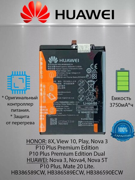 Аккумулятор LEOO ELECTRONICS для мобильных телефонов Huawei и Honor Аккумулятор LEOO ELECTRONICS предназначен для мобильных телефонов Huawei и Honor. Он обеспечивает высокую емкость 3750 мАч и выходное напряжение 3.80 В, что гарантирует стабильную работу вашего устройства. Совместимость с различными моделями Аккумулятор LEOO ELECTRONICS совместим с такими моделями мобильных телефонов Huawei, как Honor View 10, Honor 8X, Honor Play, V10, Huawei Nova 3, Huawei Nova 4, Huawei Nova 5T, Huawei Mate 20 Lite, Huawei P10 Plus, P10 Plus Premium Edition, P10 Plus Premium Edition Dual. Тип аккумулятора Li-Ion Аккумулятор LEOO ELECTRONICS использует технологию Li-Ion, которая обеспечивает высокую плотность энергии и долгий срок службы. Новый аккумулятор в заводской упаковке Аккумулятор поставляется в заводской упаковке, что гарантирует его качество и безопасность. Если у вас возникнут вопросы по поводу совместимости или качества аккумулятора, обратитесь к продавцу.