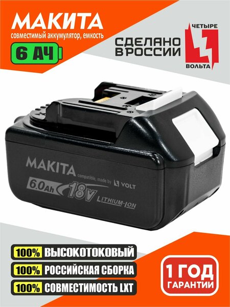 Li-ion аккумулятор - используется с 18 вольтовым ручным, садовым и строительным инструментом Makita. Сборка данного аккумулятора реализована на высокотоковых литий ионных элементах питания типоразмера 18650. Внутреннее сопротивление которых ≤ 16 мОм. Токоотдача одного элемента составляет 30 ампер. Элементы скомпонованы в группы по 5 штук и соединены в 2 параллельные связки. Что позволяет аккумулятору работать с токоотдачей до 60 ампер. Документальная емкость одного элемента питания составляет 3000 мАч, что в описанной выше сборке соответствует 6000 мАч или 6 Ач. При цикличных нагрузках емкость фактическая будет совпадать с документальной. При непрерывных интенсивных нагрузках (тепловая пушка, ветродуйка, газонокосилка, фен.) фактическая емкость будет "проседать" на 4-6% от документальной емкости. Аккумуляторы под брендом "ЧЕТЫРЕ ВОЛЬТА" собираются в России. Вы получаете 1 год гарантии. Батарея по характеристикам сопоставима с оригинальной li ion makita lxt акб 18v, отзывы довольных клиентов - приоритет компании. Литий ионный аккумулятор для инструмента MAKITA это:
