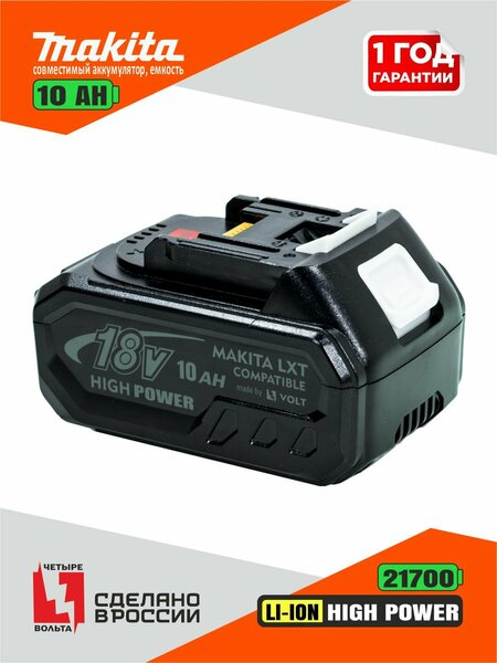 li-ion аккумулятор - используется с 18 вольтовым ручным, садовым и строительным инструментом Makita LXT. Сборка данного аккумулятора реализована на высокотоковых литий ионных элементах питания типоразмера 21700 компании Samsung, модель INR21700-50S. Внутреннее сопротивление элемента ≤ 11мОм. Стабильная токоотдача одного элемента составляет 25 ампер. Элементы скомпонованы в группы по 5 штук и соединены в 2 параллельные связки. Что позволяет аккумулятору стабильно работать с токоотдачей до 50 ампер, а в пиковых нагрузках отдавать до 90 ампер! Данный аккумулятор полноценно принимает зарядные токи до 10 ампер включительно, это позволяет аккумулятору заряжаться на "быстрых" зарядных станциях. Емкость одного элемента питания составляет 5000мАч, что в описанной выше сборке соответствует 10000мАч или 10Ач. Аккумуляторы под брендом "четыре вольта" собираются в России. Вы получаете 1 год гарантии. Гарантийное обслуживание аккумуляторной батареи осуществляется производителем на территории Российской Федерации. Будем рады видеть Вас в числе лояльных клиентов, получивших аккумуляторы, выпускаемые производственным объединением "вольт" под объединенным товарным знаком - четыре вольта.