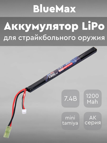 Очень компактная литий-полимерная аккумуляторная батарея производства BlueMAX. Небольшой диаметр аккумулятора позволяет без проблем установить его в любой привод АК-серии под крышку ствольной коробки. Этим он выгодно отличается от Li-Ion и LiFePO4 аккумуляторов, которые имеют довольно объемные банки. Напряжение 7.4В позволяет использовать АКБ для взвода пружин до M130. Емкость АКБ составляет 1200 mAh и этого хватает в среднем на 2000 – 2500 выстрелов в зависимости от тюнинга. На аккумулятор установлен разъем Tamiya Mini. Внимание! - Заряжайте LiPo аккумуляторы только специальной зарядкой с соответствующим режимом! - Никогда не оставляйте АКБ на зарядке без присмотра. - Избегайте физических повреждений аккумуляторной батареи и их нагрева от источников тепла (Солнце, открытый огонь и т. д.)