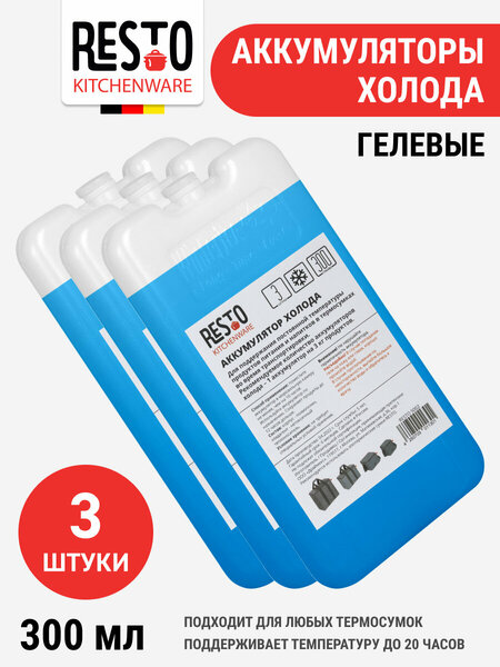 Аккумулятор холода RESTO 5002 (300 гр), набор из 3 шт Для поддержания постоянной температуры продуктов питания и напитков в термосумках во время транспортировки. Способ применения: поместите аккумулятор в морозильную камеру не менее, чем на 10 часов. После чего поместите аккумулятор в термосумку вместе с напитками/продуктами. Рекомендуемое количество аккумуляторов холода – 1 аккумулятор на 3 кг продуктов. Состав: корпус - полиэтилен, хладагент - нетоксичный теплоноситель. Внешние размеры 1 аккумулятора: 200х110х20 мм.