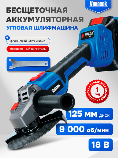 Шлифовальная машина угловая (УШМ, болгарка) бесщеточная аккумуляторная Vniissok 18V Мобильная и универсальная аккумуляторная угловая шлифовальная машина подходит для решения самых разных задач по резке, шлифовке, крацеванию и обработки поверхностей металла и камня. Модель подходит для резки металлических профилей, арматуры, труб, распила кирпича, бетона, камня, керамики, стальных конструкций, шлифования и очистки поверхностей, решения подобных задач в домашней мастерской или на приусадебном участке. Компактный бесщеточный двигатель имеет более стабильные рабочие параметры, не изнашивается и не требует обслуживания. Наличие четырех режимов работы позволяет правильно выбрать параметры машины под конкретный материал. Эргономичный корпус и малый вес обеспечивает превосходное управление инструментом и его безопасную эксплуатацию даже при интенсивном использовании. Константная электроника поддерживает обороты двигателя при изменении нагрузки для повышения качества работ. Арамидный бандаж ротора, упрочненный стальной редуктор, подшипники NSK, лабиринтная защиты от пыли повышают надежность и увеличивают срок службы инструмента. Опция мгновенной остановки диска и плавный пуск улучшает качество работы. Смарт-контролер управляет двигателем, защищает от перегрузок, оптимизирует режимы работ и экономит заряд аккумулятора. Дополнительная рукоятка, фиксируемая в двух положениях, обеспечивает оптимальный контроль инструмента при работе под правую или левую руку. Функция блокировки шпинделя облегчают замену оснастки. Единая аккумуляторная платформа MK подходит для всех типов электроинструментов и садовой техники этой линейки. Аккумуляторы доступны в различных размерах и вариантах ёмкости. Они взаимозаменяемые и имеют одинаковый разъём. Аккумулятор Li-Ion характеризуются отсутствием саморазряда и эффекта памяти. Его можно заряжать в любое время. Интегрированная BMA-система защищает элементы питания от перегрузки и перезаряда, а технология интеллектуального управления энергией экономит заряд и поддерживает энергоподачу на постоянном уровне.