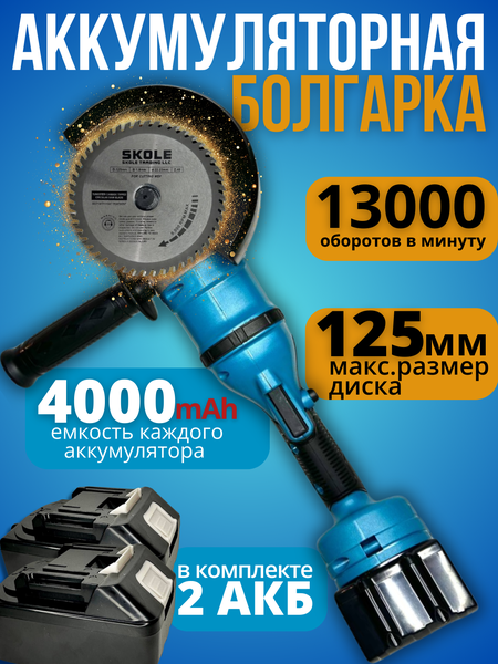 Аккумуляторная бесщеточная УШМ (болгарка) 48В с регулировкой оборотов и 2АКБ Легкая и компактная конструкция корпуса позволяет эффективно и качественно выполнять технологические операции одной рукой. Li-Ion аккумулятор на 4,0 Ач с системой защиты от перегрузки, перегрева и глубокого разряда обеспечивает полную непрерывность в работе. Функция быстрой зарядки зарядного устройства полностью восстанавливает работоспособность аккумулятора всего за 90 минут. Блокировка шпинделя обеспечивает быструю смену оснастки и повышает производительность труда. Регулировка оборотов двигателя позволяет использовать инструмент для резки, полировки и шлифовки поверхностей. Бесщеточный двигатель с высоким КПД-90%, одинаковой мощностью при вращении в обоих направлениях, точностью и простотой регулировки скорости вращения, экономным расходом энергии, уверенностью в переносимости кратковременных перегрузок и безопасностью работы. В комплект поставки входят: шлифмашина, 2 аккумулятора, зарядное устройство, защитный кожух с быстросъемным механизмом, боковая рукоятка, фланцевый ключ и кейс для удобства хранения и транспортировки. Диаметр диска составляет 125,0 мм, максимальное число оборотов - 13000,0 об/мин. Вес инструмента - 3,7 кг.
