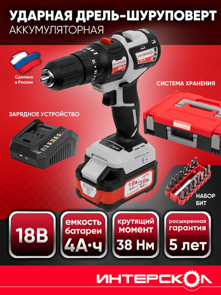 Дрель-шуруповерт с функцией осевого удара – универсальный инструмент, предназначенный для сверления отверстий в древесине, пластике, металлах и композитных материалах. Она эффективно справляется с бурением кирпича и легкого бетона, а также отлично подходит для работы с различными крепежными элементами. Особенности: • Бесщеточный двигатель с неограниченным ресурсом в два раза компактнее коллекторного двигателя и на 30% энергоэффективнее позволяет достичь большего на одном заряде аккумуляторной батареи; • Индикация уровня заряда батареи; • Блок электронного управления оборотами; • Двухскоростной планетарный редуктор со стальными шестернями; • Режим осевого удара для бурения отверстий в легких разновидностях бетона (пенобетон, шлакоблоки и т. д.); • Муфта ограничения момента затяжки («трещотка») с 18 ступенями плюс ступень сверления (блокировка муфты); • Автоматическая блокировка шпинделя для удобной замены оснастки одной рукой и одномуфтовый бесключевой патрон под оснастку с хвостовиками диаметром 1,5–13 мм. Источник питания - литий-ионные аккумуляторные батареи универсальных аккумуляторных платформ ИНТЕРСКОЛ АПИ 18В или АПИ 18/36В - могут работать с инструментом, рассчитанным на номинальное напряжение как 36 В, так и 18 В. Переключение вольтажа происходит автоматически, а система защиты полностью исключает вероятность ошибки (человеческого фактора). Мультимодульная система мультимакс 18, состоящая из универсального бесщеточного привода и до 20-ти рабочих модулей, позволяет выполнить множество разнообразных строительных, монтажных работ, кроме того, она станет отличным помощником в гараже, саду и на даче. Каждый модуль продается отдельно, позволяя сформировать необходимый пользователю набор без лишних трат. Гарантийный срок исчисляется со дня продажи потребителю и составляет: 2 года. При регистрации изделий на платформе МСТ, гарантийный срок продлевается до 5 лет.
