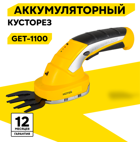 Аккумуляторный электрический триммер-кусторез Huter GET-1100 предназначен для стрижки кустарников и газонов на придомовой территории. Электромотор развивает скорость вращения до 1100 об/мин. Емкость встроенной батареи типа Li-ion составляет 1,5 А*ч. Напряжение равно 3,6 В. Этого достаточно для 20-30 минут автономного использования. Индикатор заряда аккумулятора расположен на лицевой стороне корпуса, что позволяет контролировать его уровень. Минимальный уровень шума и отсутствие вредных выхлопов обеспечивают комфортную работу. Компактный аккумуляторный электрический триммер-кусторез Huter GET-1100 имеет малый вес 1.075 кг. Корпус инструмента представляет собой платформу овальной формы. Эргономичная ручка имеет прорезиненные накладки для надежности хвата. На рукоятку вынесены кнопки пуска и блокировки лезвий. Смена оснастки и монтаж комплектных ножей не требуют дополнительных инструментов, что упрощает процесс сборки и эксплуатации. Двусторонний нож для фигурной обрезки кустарников способен справляться с ветками толщиной до 8 мм. Нож для травы предназначен для оформления аккуратного края газона, стрижки растительности вдоль ограждений, вокруг деревьев и других препятствий. Оптимальная геометрия лезвий обеспечивает быструю обрезку растений.