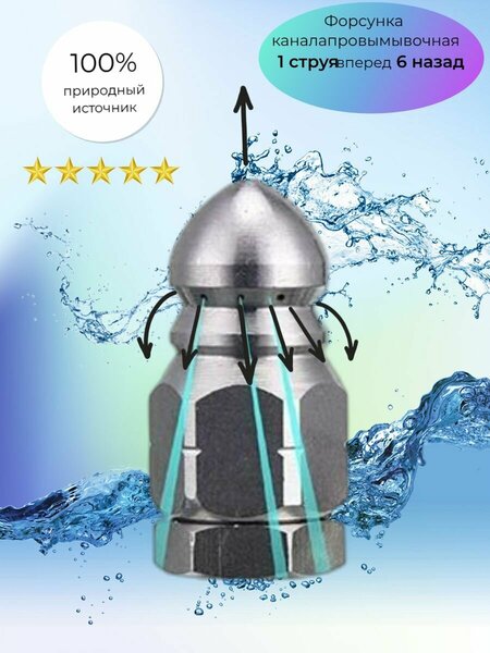 Форсунка каналопромывочная 1 струя вперед 6 струи назад на шланг прочистки труб канализации. Используется для эффективной очистки труб от грязи, песка, и жира. Особенности: Форсунка 1 струя вперед 6 назад для эффективной очистки труб малых и средних диаметров. Преимущества: