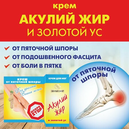 Крем от пяточной шпоры "Акулий жир и золотой ус". Мазь от подошвенного фасциита. Чудо мазь. Пяточная шпора - это заболевание, характеризующееся болезненными ощущениями в области подошвы, что обусловлено образованием костного разрастания пяточной кости в месте прикрепления подошвенной мышцы. В начале заболевания боль возникает при ходьбе. Особенно трудно начало ходьбы, когда при нагрузке возникает острая боль. Причинами образования пяточной шпоры являются:
