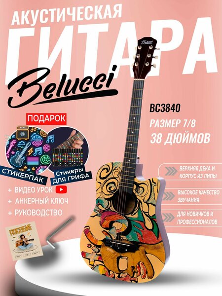 Акустическая гитара Belucci BC3840 1347 (Lone) - отличный выбор для любителей музыки и домашнего музицирования. С ее помощью вы сможете исполнять различные музыкальные композиции и наслаждаться качественным звучанием. Гитара оснащена металлическими струнами, которые обеспечивают громкое и звонкое звучание. Гриф усилен анкером, что позволяет регулировать высоту струн и делает игру на инструменте более комфортной и удобной. Корпус инструмента изготовлен из высококачественной липы, что обеспечивает сбалансированное звучание и долговечность. Гриф выполнен из клена, накладка грифа и бридж - из пластика. Количество ладов составляет 18, что позволяет исполнять различные музыкальные композиции. Гитара имеет правостороннюю ориентацию, что делает ее удобной для правшей. Цвет гитары - глянцевый Lone, что придает ей стильный и современный вид. В комплекте с гитарой идут шесть медных струн, которые обеспечивают мягкое и приятное звучание. Выбирая акустическую гитару Belucci BC3840 Lone, вы получаете качественный и надежный инструмент для домашнего музицирования и наслаждения музыкой.
