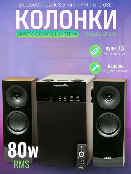 Dialog Progressive AP-250 - это мощная акустическая система с функцией караоке, Bluetooth, FM-тюнером и слотом для карт памяти SD. Она имеет два динамика по 15 Вт и сабвуфер мощностью 50 Вт, что создает объемное и насыщенное звучание. Караоке-режим позволяет петь любимые песни вместе с друзьями или семьей, а функция Bluetooth позволяет подключать смартфон или планшет для воспроизведения музыки. FM-тюнер позволяет слушать радио без подключения к интернету. USB-порт и слот для карт памяти позволяют воспроизводить музыку с USB-накопителей и карт памяти. Dialog Progressive AP-250 также имеет функцию регулировки тембра и громкости, что позволяет настроить звук под свои предпочтения. Эта акустическая система станет идеальным выбором для вечеринок, концертов и просто для прослушивания музыки в хорошем качестве.