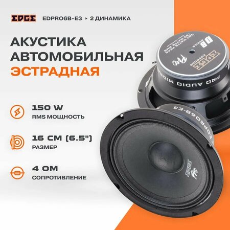 Акустика EDGE EDPRO6B-E3: высококачественное звучание и удобство установки Акустика EDGE EDPRO6B-E3 представляет собой среднечастотную автоакустику, которая обеспечивает качественное звучание и удобство установки в вашем автомобиле. Номинальная мощность 150 Вт и максимальная мощность 300 Вт Акустика EDGE EDPRO6B-E3 обладает номинальной мощностью 150 Вт и максимальной мощностью 300 Вт, что позволяет ей воспроизводить громкий и чистый звук. Чувствительность 92 дБ и импеданс 3,2 Ом Акустика EDGE EDPRO6B-E3 имеет чувствительность 92 дБ, что обеспечивает отличную передачу звука, а импеданс 3,2 Ом делает ее совместимой с большинством автомобильных усилителей. Типоразмер 16,5 см (6 1/2 дюймов) и композитные волокна Акустика EDGE EDPRO6B-E3 имеет типоразмер 16,5 см (6 1/2 дюймов), что позволяет устанавливать ее в большинство автомобилей. Материал СЧ-диффузора – композитные волокна, обеспечивающие прочность и долговечность. В комплект поставки входят автоколонки, установочный комплект и документация, что упрощает процесс установки и использования акустики. Акустика EDGE EDPRO6B-E3 – отличное решение для тех, кто хочет улучшить качество звука в своем автомобиле и наслаждаться мощным и чистым звуком.