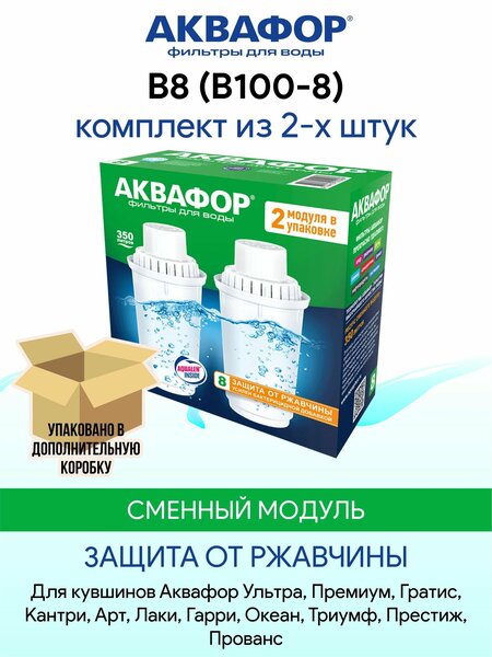 Картридж В8 (В100-8) используется в кувшинах Аквафор с круглым гнездом посадки для картриджа диаметром 7 см: Арт, Гарри, Гратис, Кантри, Лаки, Орлеан, Премиум, Престиж, Прованс, Триумф, Ультра. С картриджами B8 (B100-8) в вашем фильтре кувшине, на кухне всегда будет чистая безопасная вода, чтобы готовить для близких. Модуль Б8 (Б100-8) эффективно удаляет соединения железа, что дает повышенную защиту от ржавчины. Ресурс каждого модуля - 350 литров. Когда один закончится, вы сможете заменить его за несколько минут. В комплекте 2 модуля картриджа для фильтра кувшина Аквафор B8 (B100-8), В8 (В100-8), Б8 (Б100-8).