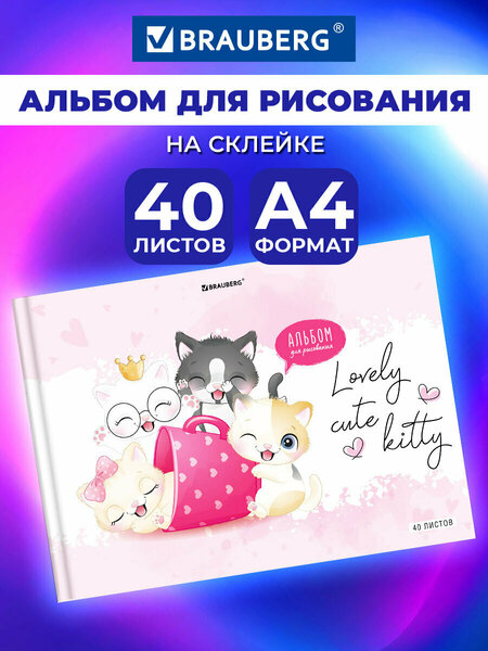 Альбом для рисования А4 40л с обложкой из мелованного картона от BRAUBERG — идеальный выбор для всех, кто увлекается живописью. Этот альбом для рисования формата А4 (207х297мм) создан специально для тех, кто ценит качественную канцелярия для школы или для домашнего творчества. Плотная бумага для акварели А4 с плотностью 100 г/м2 не промокает, не коробится при высыхании и делает краски более яркими. Обложка с милыми котиками порадует девочек и станет вдохновением для создания новых шедевров. Скрепление листов с помощью открытой склейки позволяет легко отделить лист и вставить рисунок в рамку. Этот альбом идеально подходит для смешанных техник рисования: красками, карандашами и фломастерами. Выбирая альбомы для рисования BRAUBERG, вы получаете качественную бумагу, которая станет отличным дополнением вашей канцелярии. • Количество листов: 40. • Формат: А4. • Обложка: мелованный картон. • Тип спецэффектов на обложке: нет. • Тип товара: альбом для рисования на склейке. • Дизайн: Милые Котики. • Тип скрепления: склейка. • Плотность бумаги: 100 г/м2. • Пол ребенка: для девочек. • Количество дизайнов в минимальной упаковке: 1 шт. • Количество дизайнов в транспортной упаковке: 1 шт. • Индивидуальная упаковка: да. • Артикул производителя: 107026.