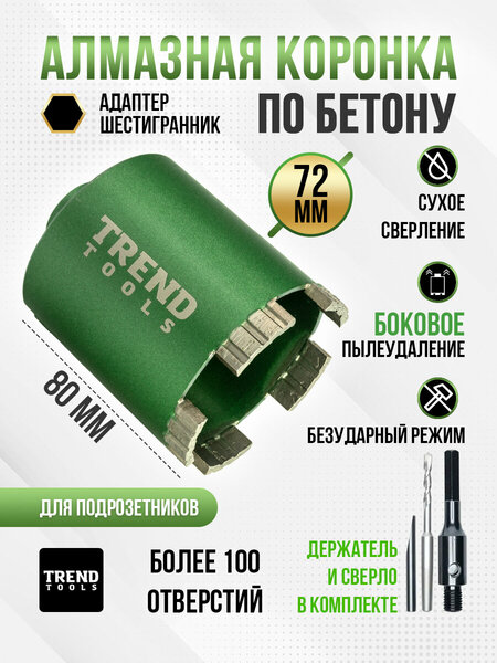 Коронка по бетону и кирпичу алмазная Trend Tools 72 мм для подрозетников, держатель Шестигранник, боковое пылеудаление