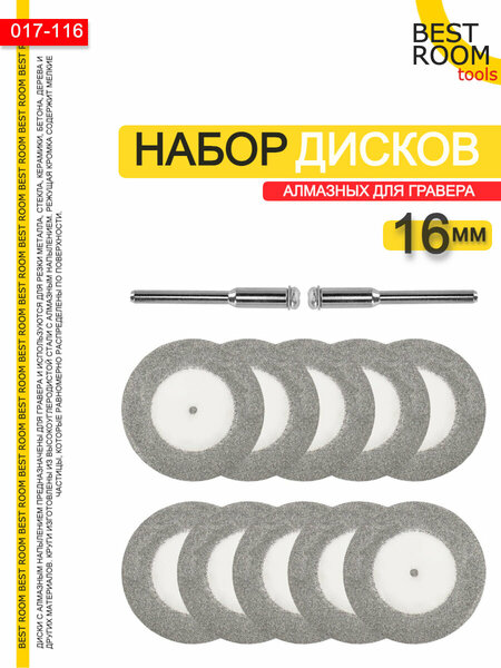 Алмазный диск для гравера: функциональность и преимущества Алмазный диск для гравера представляет собой набор из 10 отрезных дисков одинакового диаметра и двух штоков диаметром 3 мм. Этот инструмент предназначен для работы с гравировальной машинкой и обеспечивает высокую эффективность при обработке металла. Алмазное напыление и максимальная скорость Диски имеют сплошное алмазное напыление, что обеспечивает высокую скорость резки до 12000 оборотов в минуту. Толщина алмазного слоя составляет 1 мм, это гарантирует быстрое и качественное выполнение работ. Сухая и влажная резка Алмазный диск подходит для сухой и влажной резки, что позволяет использовать его в различных условиях и на разных материалах. Прочный материал и диаметр диска Диски изготовлены из прочного материала, что обеспечивает их долговечность и надежность в использовании. Диаметр диска составляет 16 мм, а посадочный диаметр – 3,2 мм, что позволяет использовать его на большинстве гравировальных машин. В упаковке вы найдете 10 алмазных дисков и два штока диаметром 3 мм, что позволит вам всегда иметь под рукой запасное оборудование. Выбирая алмазный диск для гравера, вы получаете надежный и качественный инструмент, который станет незаменимым помощником в вашей работе.