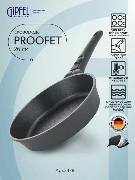 Сковорода размером 26x6 см изготовлена из литого алюминия, что позволяет ей равномерно нагреваться и распределять тепло. Толщина стенок 2 мм, толщина дна 4,7 мм. Сковорода Gipfel Proofet с 2-слойным антипригарным покрытием Whitford Xylan Plus идеальна для ежедневного применения. Еда в ней не пригорает и не прилипает ко дну. Благодаря толстому дну и многослойному покрытию, вы добьётесь превосходных результатов в приготовлении гарниров и основных блюд. Такие ингредиенты, как мясо или овощи, не изменят свои вкусовые свойства. Съемная ручка делает ее удобной в хранении. Без ручки сковорода подойдет для микроволновой печи и духового шкафа. Ручка выполнены из бакелита – термостойкого пластика, который не нагревается. Сковорода в фирменной упаковке. Рекомендации по использованию и уходу: Не использовать металлические лопатки. Не мыть жесткой металлической губкой и чистящими порошками. Не разрезать приготовленную пищу в посуде. Не подвергать термошоку. Не жарить еду без масла. Можно использовать на всех типах плит. Дополнительную ручку для сковороды Proofet вы можете заказать здесь. К сковороде подходят крышки: Крышка Gipfel 1039 Крышка Gipfel 1042 Крышка Gipfel 50210